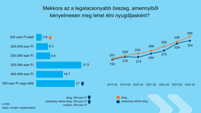 A válaszadók legnagyobb részaránya, 32 százaléka 300 és közel 400 ezer forint közötti havi bevételből tudná elképzelni a problémamentes nyugdíjaskort. Jelentős a 400-499 ezer forintos sávba tartozók aránya is, ami megközelítette a 20 százalékot. Az átlagérték jelentős emelkedését azonban egyértelműen az 500 ezer forint feletti összegek minden korábbinál magasabb említettsége okozta; a középkorúak több mint negyede legalább nettó félmilliós összeget tartana szükségesnek egy valóban kényelmes nyugdíjas élethez.