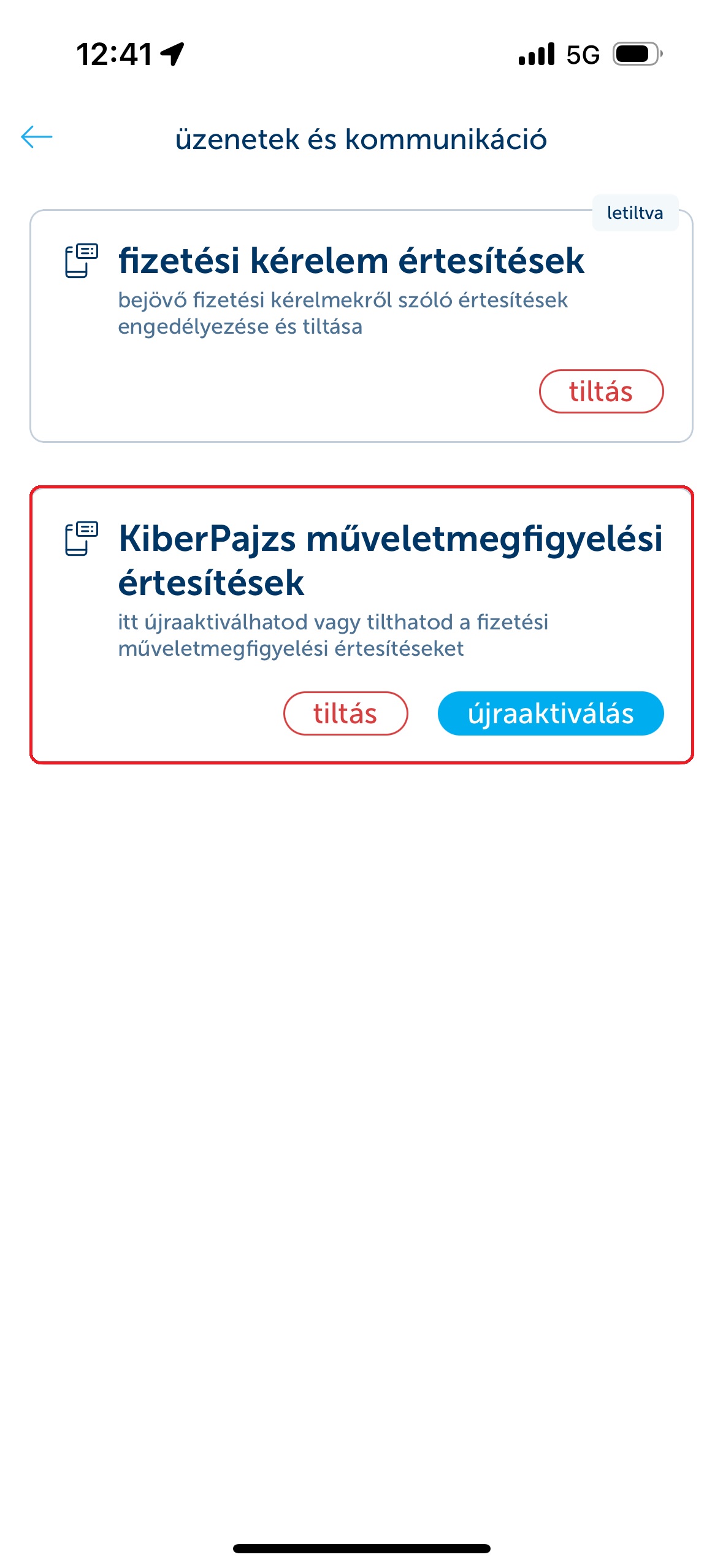 A KiberPajzs műveletmegfigyelési értesítés szolgáltatásról a betéti kártyabirtokos tud leiratkozni. Fontos, hogy a leiratkozás minden rendelkezésedre álló kártyára vonatkozik (lakossági és üzleti), nem kártyánként állítható. Amennyiben a betéti kártyás tranzakciós értesítésekről már leiratkoztál, a számlás terhelési értesítéseket sem fogjuk számodra küldeni. Ha bármelyik értesítésről leiratkozol, a neked szóló összes KiberPajzs műveletmegfigyelési értesítés küldését leállítjuk. A leiratkozást megteheted: