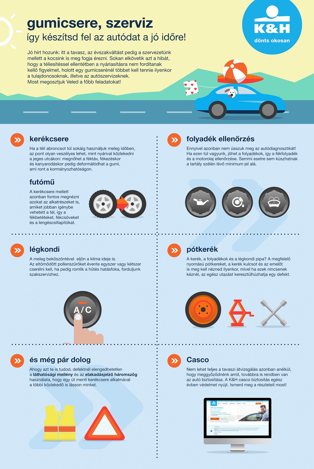 A kerék, a folyadékok és a légkondi mindegyike pipa? Lehet is indulni akkor, ugye? Ne olyan sietősen! Noha mind a négy évszakban szükséges a pótkerék (és a megfelelő keréknyomás ellenőrzése a pótkerékben), a kerék kulcs és az emelő kocsiban tartása, az átvizsgálás során azonban külön kell ellenőrizni ezt a hármast is, mivel éppen egy gyönyörű napfényes országúti kocsikázást tud keresztülhúzni egy defekt, ha ezek nincsenek kéznél. Természetesen defektnél elengedhetetlen a láthatósági mellény és az elakadásjelző háromszög használata is, hogy egy út menti kerékcsere alkalmával a többi közlekedő megfelelően észlelhessen minket.
