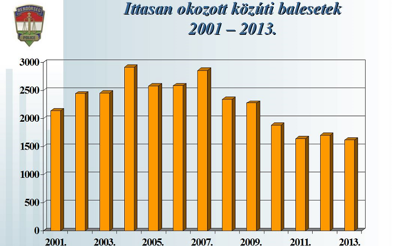 A rendőrség adatai szerint Magyarországon lassan csökken az ittasan okozott balesetek száma. Míg 2012-ben 1 645 szeszesitaltól befolyásolt vezető, addig 2013-ban 1 616 ilyen sofőr miatt történt személysérüléses közúti balesetet, ami 1,76%-os csökkenés.