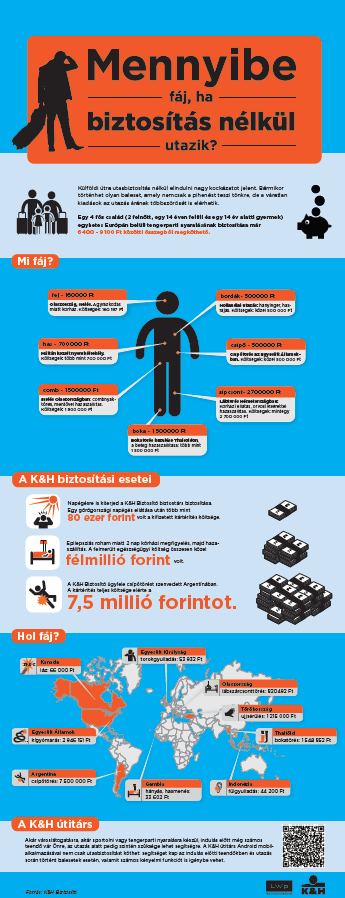 A nyár végezetével a K&H Biztosító összegyűjtötte az elmúlt másfél év utasbiztosításokkal kapcsolatos tapasztalatait, és az összesített eredményt infógrafikájával szemlélteti. A felhasznált biztosítási események jól mutatják, hogy a legkisebb sérülés, vagy egy ártatlan megfázás kezelése is súlyosan megterhelheti a pénztárcánkat külföldön. Ha hazaszállítás, vagy például speciális mentés is társul az ellátáshoz, könnyen milliós összegre rúghat a számla. Elég, ha egyszer kerül ilyen helyzetbe valaki nyaralás alatt, biztosítás nélkül, és szinte megoldhatatlan helyzetben találja magát. Egy négyfős család egyheti, Európán belüli tengerparti nyaralásának biztosítása már összesen 6 400 - 9 100 Ft közötti összegből megköthető. Azaz a költség nem több mint átlag 2000 Ft személyenként.
