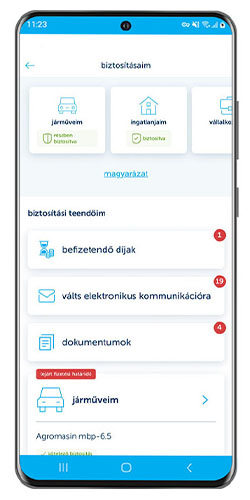 Megtekinthetőek a biztosítások részletei, lehetőség van díjfizetésre és kárbejelentésre, valamint új biztosítást is lehet kötni. A biztosítási szerződésekre elektronikus kommunikációt lehet igényelni, ezután a szerződéssel kapcsolatos leveleket ide töltjük fel.