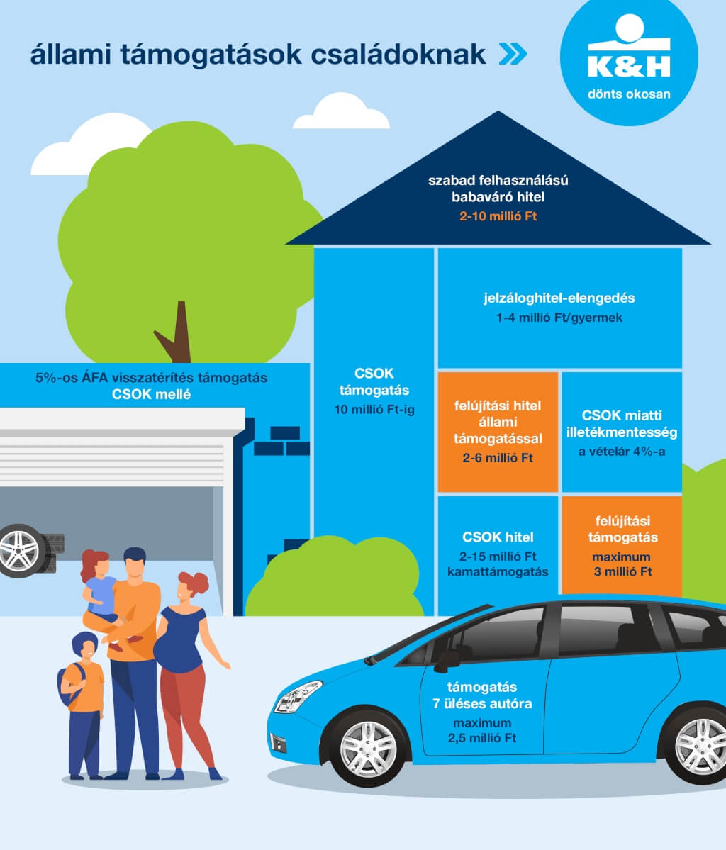 CSOK esetében a termék részletes leírását, illetve feltételeit a 16/2016. (II. 10.) számú az új lakások építéséhez, vásárlásához kapcsolódó lakáscélú támogatásról szóló, 17/2016. (II. 10.) számú a használt lakás vásárlásához, bővítéséhez igényelhető családi otthonteremtési kedvezményről szóló Kormányrendelet, a vonatkozó szerződés, az Általános Szerződési Feltételek, a K&H Bank Üzletszabályzata, valamint az aktuális hirdetmény tartalmazza, melyek megtekinthetők a bankfiókokban és a www.kh.hu internetes oldalon.