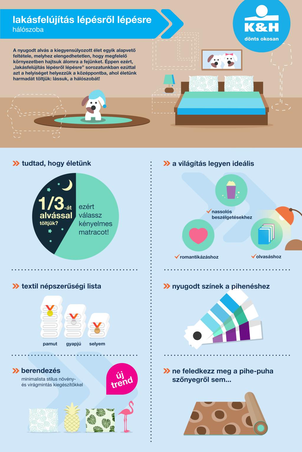 A bútorok mellett a világítás sem utolsó szempont. Milyen az ideális világítás a hálószobában? Meleg fényű és nem túl erős. Ha kell, akkor megvilágítja az egész szobát; ha éppen arra van szükség, akkor meghitt és nyugtató, de ha ahhoz támad kedvünk, az elalvás előtti olvasásnak sem áll útjába. A teljes helyiség megvilágítására a mennyezeti spotlámpák a legalkalmasabbak, míg az olvasáshoz célszerű egy kisebb fényforrást szerelni az ágy mellé, ami koncentrált megvilágítást tesz lehetővé. Az egyre több helyen beszerezhető, színváltós LED-szalagok pedig a hangulatvilágítás talán legpraktikusabb alternatívái.
