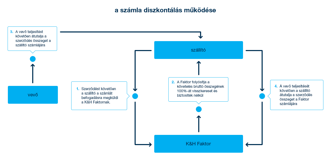 K&H Faktor Ügyfeleinek vevő fizetésképtelenségéből származó kockázatok csökkentésére, mérlegstruktúra optimalizálására és finanszírozásra irányuló igényeinek megoldására dolgozott ki egy, a magyar piacon is kiemelt terméket, az Invoice Discounting-ot.