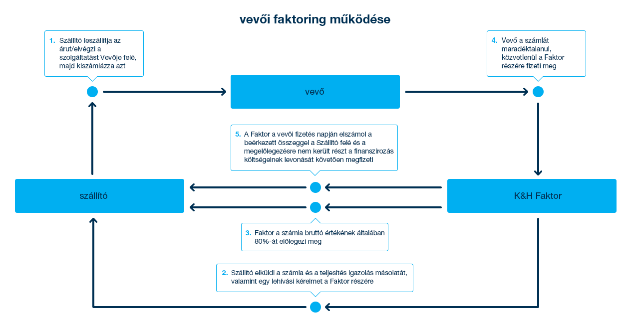 A K&H Faktor az áruszállításból vagy szolgáltatásnyújtásból származó, rövid lejáratú, a vevő által elismert és leigazolt, nem lejárt követeléseket megvásárolja és megelőlegezi, így juttatva hamarabb pénzükhöz Ügyfeleit.
