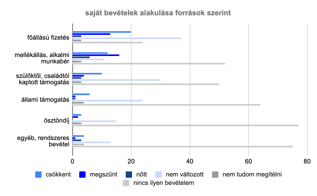 A fiatalok 13 százaléka azt mondta, hogy a főállásból származó bevétele megszűnt, 20 százalékának jelentős mértékben visszaesett. A mellékállásból származó jövedelem megszűnése vagy csökkenése 28 százalékukat érintette. A 26-29 éves korosztály tagjainak 45 százaléka kapott kevesebbet az első számú munkahelyéről, ezen belül 19 százalékuk egyáltalán nem kapott fizetést.