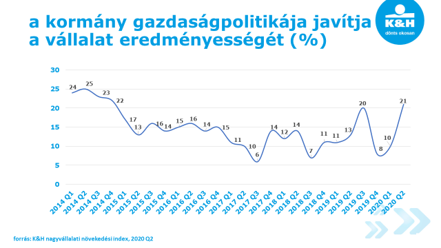 A vállalati döntéshozók visszajelzései alapján a vírusjárvány csak rövid távon befolyásolta kedvezőtlenül a gazdasági helyzet megítélését. Bár a cégek több mint ötöde (21%) romlásra számít, az előző negyedévhez képest jelentősen, 16 százalékról 30 százalékra növekedett azok aránya, akik szerint a magyar gazdaság helyzete javul egy éves időtávban. Középtávon viszont már nem számolnak a járvány hatásaival a vállalatvezetők, ugyanis 39 százalékuk számít javuló gazdasági környezetre. Valószínűsíthető, hogy a cégek a bejelentett gazdasági kormányintézkedések miatt gondolják azt, hogy a járvány nem lesz hosszú távon hatással a gazdaságra, ugyanis szignifikánsan, 21 százalékra nőtt azok aránya, akik szerint a kormány gazdaságpolitikája javítja vállalatuk eredményességét. Ez az arány 2014 óta nem nőtt 20 százalék fölé.