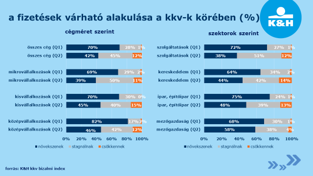 A KSH legfrissebb adatai alapján idén májusban 9,4 százalékkal, 398 800 forintra nőtt a bruttó átlagkereset az előző év azonos időszakához képest. „A keresetnövekedés lendülete megtörhet a következő egy évben, ugyanis a K&H kkv bizalmi index eredményei alapján jelentős változás várható az átlagfizetésekben. Az előző negyedévhez képest 28 százalékponttal kevesebben, a hazai cégvezetők 42 százaléka tervezi csak a bérek növelését, és a kkv-k közel fele (45 százalék) nem tervez munkabért érintő változással a következő egy évben. Emellett jelentősen növekedett azok aránya, akik keresetcsökkenésre számítanak, közel minden tizedik kkv (12 százalék) számol ezzel” – foglalta össze az eredményeket Kökény Roland, a K&H kkv marketing főosztály vezetője.