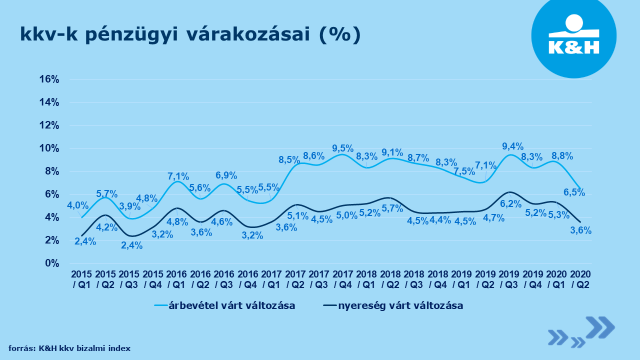 „A K&H kkv bizalmi index kutatás legfrissebb eredményei alapján mérsékelten csökkent a hazai kkv szektor árbevétel- és nyereségvárakozása a következő évre. A várt árbevétel-növekedés mértéke 7,1 százalékról 6,5 százalékra, a várt profitnövekedés mértéke pedig 4,7 százalékról 3,6 százalékra csökkent az előző év azonos időszakában mért értékhez képest. Az előző negyedévben a kilátások kedvezőbbek voltak, ugyanis 8,8 százalékos árbevétel, és 5,3 százalékos nyereségvárakozással számoltak a cégek. A szolidabb várakozások hátterében az állhat, hogy a cégek szerint a vírusjárvány miatti legnagyobb pénzügyi kiesés már megtörtént, a felmérés szerint a vírusjárvány következtében átlagosan 22 százalékkal csökkent a bevételük, amelynek áthidalására a hitelfelvételben gondolkodó cégek 84 százaléka hatékony megoldásnak tartja az NHP Hajrá programot” – mondta el Kökény Roland, a K&H kkv marketing főosztály vezetője.