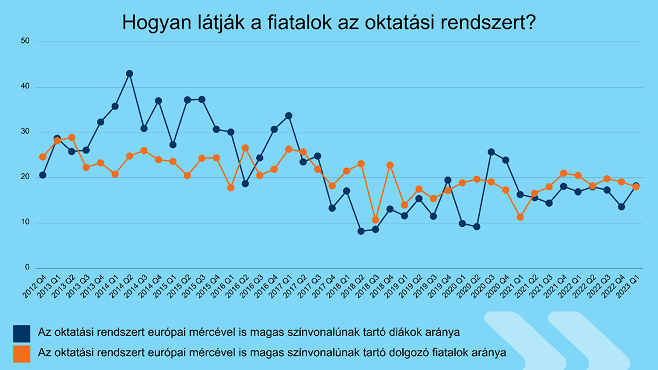 A felmérésből kiderül továbbá, hogy a dolgozó fiatalok hogyan értékelik az oktatás színvonalát. A diákokhoz hasonlóan csak 18 százalékuk szerint említhetőek egy lapon a magyarországi oktatási intézmények európai társaikkal. 55 százalékuk negatív véleményt fogalmazott meg, 23 százalékuk szerint nincs igazán különbség. A korábbi kutatásokban hasonló volt a pozitív véleményt megfogalmazó dolgozó fiatalok aránya, jellemzően 20 százalékot tett ki.