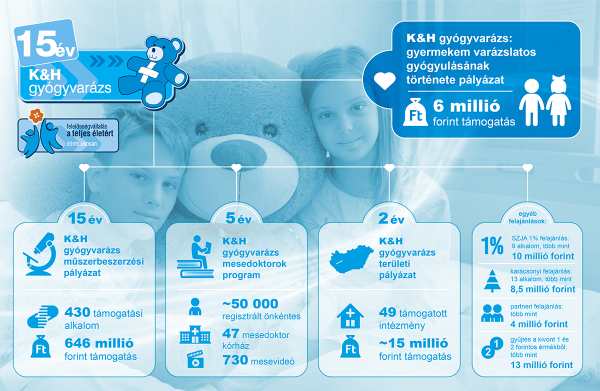 Az idén 15 éves K&H gyógyvarázs program egy különleges kezdeményezéssel ünnepelte évfordulóját. A K&H gyógyvarázs: gyermekem varázslatos gyógyulásának története pályázaton nemcsak az egészségügyi intézmények gazdagodhattak új, modern műszerekkel, hanem a gyerekek példamutató élni akarását és a szülők tiszteletet parancsoló kitartását is értékelték és ünnepelték. A pénzintézet és médiapartnerei arra biztatták a szülőket, hogy küldjék be gyermekük gyógyulásának történetét, amivel gyermeküknek óriás plüssmacit, az általuk megnevezett kórháznak pedig 1 000 000 forint értékű műszertámogatást nyerhettek. A K&H ezzel is hozzá kíván járulni ahhoz, hogy a gyermekgyógyító intézményekben dolgozó orvosok és ápolók minél korszerűbb eszközökkel tudják meghozni okos döntéseiket, és a beteg gyermekek mihamarabb újra teljes életet élhessenek.