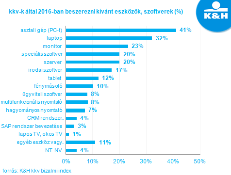 A K&H kkv bizalmi index tíz éves történetében szinte mindig informatikai fejlesztésekre készült a legtöbb cég, akárcsak a legutóbbi felméréskor is. Az eredmények azt mutatják, hogy a vállalkozások nagy része nem változtat a jelenlegi eszközállományán. „A vállalatok többsége (57%) nem készül sem cserére, sem bővítésre, így a már meglévő informatikai eszközökkel kíván dolgozni idén is. Minden harmadik vállalat tervez valamilyen változtatást vagy új vásárlást, közülük legnagyobb arányban azok a cégek vannak, amelyek idén lecserélik a meglévő eszközöket, és új gépekkel fognak dolgozni (13%). Minden kilencedik kkv új beszerzést és a mostani számítógépek cseréjét is tervezi, míg a cégek 9%-a a meglévő eszközök mellé fog újakat vásárolni idén” – részletezte az eredményeket Kovács Viktor Zoltán, a K&H kkv marketing főosztály vezetője.