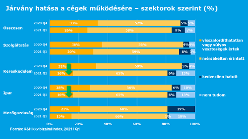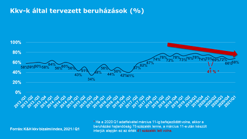 A járvány negatív hatása lassan enyhülni látszik a hazai kis- és középvállalkozások körében, ugyanis a második hullámhoz képest mérséklődött azok száma, akiknek csökkent az árbevétele, valamint azok aránya is, akiket kedvezőtlenül érintett a pandémia kapcsán kialakult gazdasági helyzet. Ennek ellenére csak visszafogottan terveznek fejlesztéseket: a K&H kkv bizalmi index első negyedéves kutatása alapján a cégek beruházási hajlandósága folyamatosan csökkenő tendenciát mutat, melyet a járványhelyzet tovább erősített. A kkv-k óvatosságát a gyorsan változó árfolyam is indokolhatja, ami a cégek harmadának üzleti tevékenységét akadályozza.