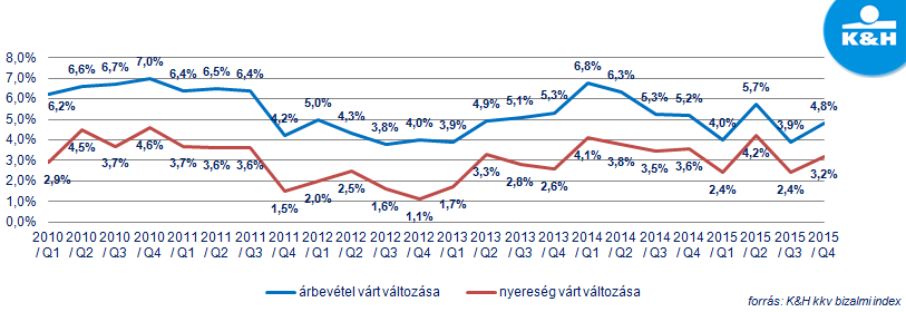 A hazai vállalkozások eredményüket tekintve is derűlátóbbak lettek 2,4%-ról 3,2%-ra ugrott a várt profit mértéke a teljes kkv szektor szintjén. Idén a kkv-k 91%-a vár növekedést, azonban a tavalyinál kisebb nyereséggel számoló cégek aránya közel duplájára, 5%-ról 9%-ra nőtt. Az eredményeket tekintve a középvállalkozások és a mikrovállakozások hasonlóan jó eredményt valószínűsítenek – 3,7% és 3,5% –, míg a kisvállalkozások e tekintetben is szerényebbek, mindössze 2,6%-os profitnövekedést várnak idén. A szektorok közül a mezőgazdasági és szolgáltató cégek visszafogottabbak – 2,3% és 2,7% –, míg a kereskedelmi és ipari cégek közel azonos mértékékű, ennél jóval nagyobb nyereség-növekedést várnak (3,6% és 3,7%).