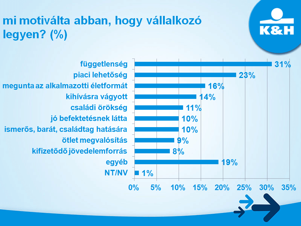 A félezer hazai kkv megkérdezésével történt felmérés arra kereste a választ, hogy a cégvezetőket mi késztette vállalkozásuk létrehozására. „Az eredmények azt mutatják, hogy a vállalkozói létben egyértelműen a függetlenség a legmotiválóbb tényező (31%), a cégvezetők majd negyedét (23%) pedig éleslátása segítette a vállalkozóvá válásban, hiszen olyan piaci lehetőséget látott meg, amelyet nem lehetett kihagyni. Emellett egy részük egyszerűen megunta az alkalmazotti létet, illetve inkább kihívásra vágyott” – mondta el Kovács Viktor Zoltán, a K&H kkv marketing főosztály vezetője. Érdekes adat, hogy durván minden tizedik cégvezető a családi örökség részeként lett vállalkozó, miközben további 9%-ot saját ötletének megvalósítása terelt ebbe az irányba.