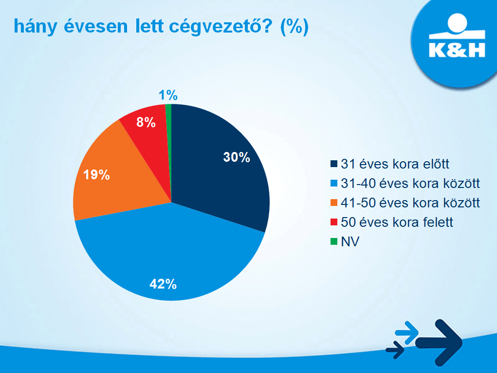 A kutatás azt is feltérképezte, hogy Magyarországon átlagosan hány évesen lesz valakiből cégvezető. „Az eredményekből az látszik, hogy leginkább fiatal felnőttkorban válunk cégvezetővé. A legtöbben ugyanis 31-40 éves korban (42%), egy jelentős részük pedig ennél is fiatalabban, 31 éves kora előtt éri el ezt a pozíciót (30%). Nem ritka azonban az sem, hogy valaki 50 éves kor felett jut el idáig (8%), sohasem késő tehát megvalósítani álmainkat” – tette hozzá Kovács Viktor Zoltán.