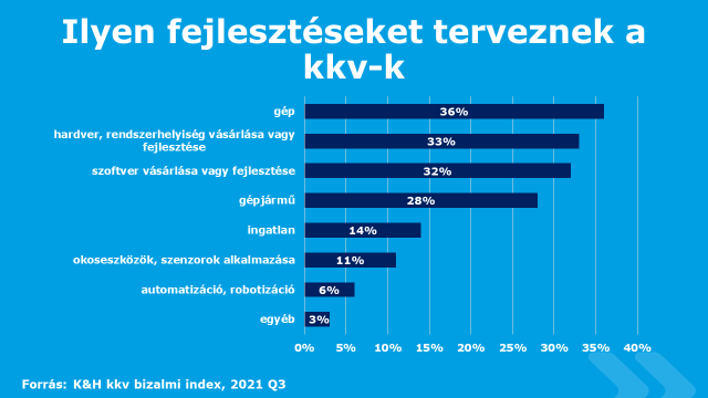 A cégek nagyjából háromnegyede készül beruházni a következő egy évben, derült ki a K&H kkv bizalmi index kutatás legutóbbi eredményéből. A legtöbben informatikai fejlesztésre, ezen belül főként hardver és szoftvervásárlásra készülnek. A következő egy év fejlesztéseiben a legaktívabbak a középvállalkozások lehetnek, akiknek 85 százaléka tervez beruházást.