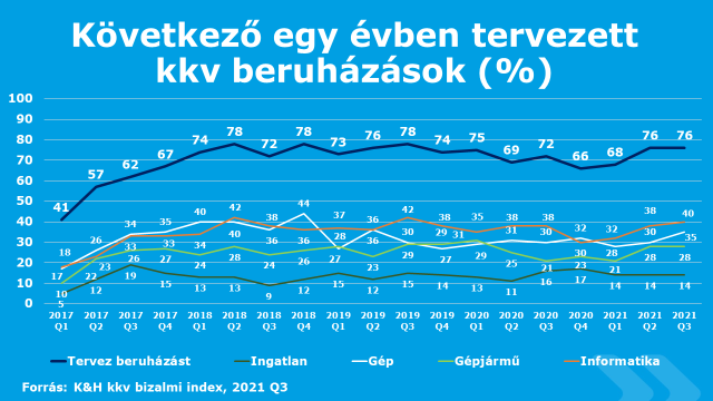 Második negyedéve áll a járvány előtti időszakot idéző, 76 százalékon a következő egy évben fejlesztést tervező cégek aránya a K&H kkv bizalmi index kutatás harmadik negyedéves adatai alapján. Ez mindössze 8 százalékponttal alacsonyabb a mikro-, kis- és középvállalkozások várakozásait vizsgáló felmérés – még 2006 első negyedévében felállított – csúcsértékénél. „A kkv-k optimista tervei bizakodásra adnak okot az ország gazdasági növekedését nézve, hiszen a több beruházás hatására gyorsabban növekedhet a GDP. Nem szabad azonban elfeledkezni a koronavírusról, amelynek negyedik hulláma újfent komoly kihívásokat állít a cégek elé. Két erős negyedéven vagyunk túl, de csak jövőre fog kiderülni, hogy magunk mögött tudhatjuk-e a nehézségeket” – értékelte a jelenlegi eredményeket Rammacher Zoltán, a K&H kkv marketing és értékesítés támogatás vezetője.