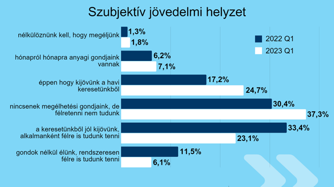 Összességében a 30-59 éves korosztály anyagi helyzetének és szubjektív biztonságérzetének megítélése kedvezőtlen képet mutat: 2017 első negyedéve óta nem volt olyan alacsony, mint most. Az elmúlt negyedévek eredményeit tekintve negatív trend rajzolódik ki, azaz egyre többen vannak, akik szerint rosszabb lett a helyzetük. Az idei első negyedévben a válaszadók 24 százaléka mondta azt, hogy kifejezetten biztonságosnak érzi az anyagi helyzetét, míg 21 százalékuk kifejezetten pesszimistának számít ezen a téren. Beszédes változás, hogy az előbbiek aránya egy évvel korábban 31 százalékos volt, utóbbiaké viszont jóval alacsonyabb, 17 százalékot tett ki.