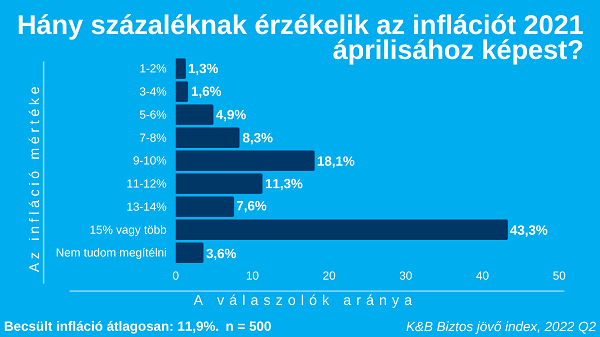 Az eredmények alapján 43 százalék azt mondta, hogy 15 százalékos vagy azt meghaladó inflációval szembesült, további 19 százalék pedig 11-14 százalékos áremelkedésről számolt be. A válaszadók harmada - 34 százaléka - egy számjegyű inflációt észlelt, 4 százalékuk nem tudott pontos választ adni. Fontos, hogy a kutatásban nem pontos értékek, hanem kategóriák szerepeltek, amelyek közül a legtöbben a 15 százalékos vagy azt meghaladó inflációt tartották igaznak. Minden megkérdezettre vetítve a becsült infláció 11,9 százalékot tett ki, ami jóval meghaladja az áprilisi 9,5 százalékos tényadatot.