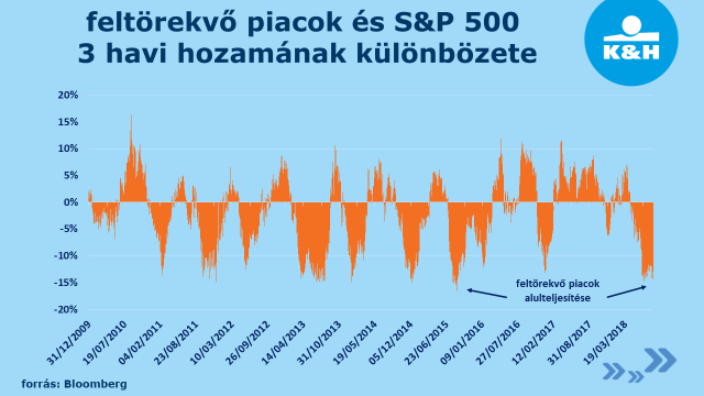 „A piacok múltbeli viselkedését vizsgálva bízhatunk abban, hogy a feltörekvő piacok gyengélkedése már nem tart sokáig, hiszen az amerikai és feltörekvő piacok 3 hónapra visszatekintő hozamkülönbsége jelenleg már extrém szint közelében tartózkodik: 10%-nál nagyobb alulteljesítés ugyanis nem jellemző. A lassan normalizálódó helyzethez persze a gazdasági kilátások javulása is szükséges, amit akár konstruktív amerikai-kínai kereskedelmi tárgyalások vagy a dollár gyengülése is kiválthat” – mondta el Hajósi Péter. „Bár ezekre egyelőre nincs túl sok remény, azt is látni kell, hogy a befektetők a feltörekvő részvényeszközök eladására játszanak, tehát már szinte mindenki alulsúlyozza őket. Így akár már a pesszimista forgatókönyveknél csupán kissé kedvezőbb hírek is pozíciózárásokhoz és a fejlett piachoz felzárkózó feltörekvő piaci tőzsdemutatókhoz vezethet” – mutatott rá a befektetési szakember.