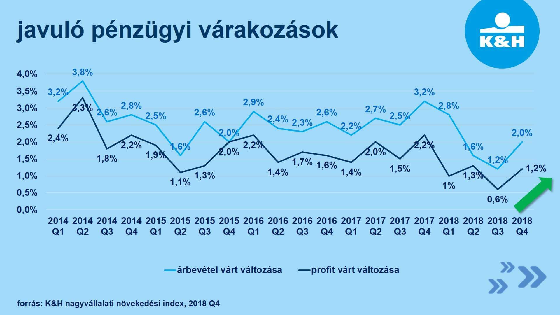 A hazai, 2 milliárd forint feletti éves árbevételű, nem-állami nagyvállalatok derűlátóbbak lettek pénzügyeik jövőbeni alakulását illetően. „A K&H nagyvállalati növekedési index legutóbbi eredménye szerint a jelenleginél átlagosan 2%-kal vár nagyobb árbevételt a szektor. Ez mindenképpen figyelemre méltó előrelépés az előző negyedévhez képest (1,2%), amivel így megtört az egy éve tartó erőteljes csökkenő trend is. A javulás örvendetes, azonban még ezzel együtt is ez igen visszafogott eredménynek tekinthető, hiszen elmarad a korábban jellemző 2,5% körüli várakozástól, illetve az infláció mértékétől is, ami legfrissebb adatok szerint januárban 2,7% volt” – tájékoztatott Patrick Van Overloop, a K&H Üzleti ügyfelek divízió vezetője. Az árbevétel mellett a profitvárakozások is javultak, ugyanis az előző negyedévi mélyponthoz képest dupla akkora, 1,2%-os nyereségbővüléssel számolnak idén a cégek.