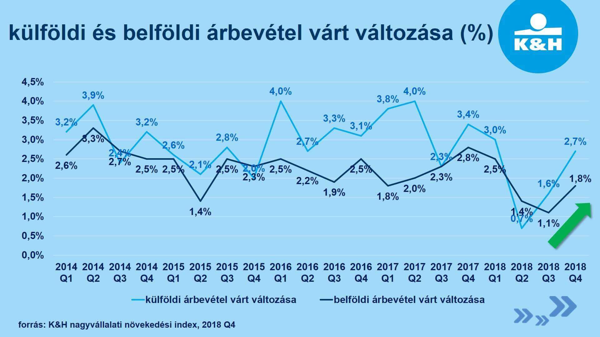 Az előző negyedévi mélyponthoz képest jelentősen javultak a hazai vállalatok következő egy évre vonatkozó árbevétel és eredményvárakozásai, de még ezzel együtt is szerény bővülést várnak a cégek idén – jelzi a K&H nagyvállalati növekedési index. A szektor átlagosan 2%-os árbevétel és 1,2%-os eredménynövekedést valószínűsít 2019-ben, és továbbra is az exportpiacokban lát nagyobb fantáziát.