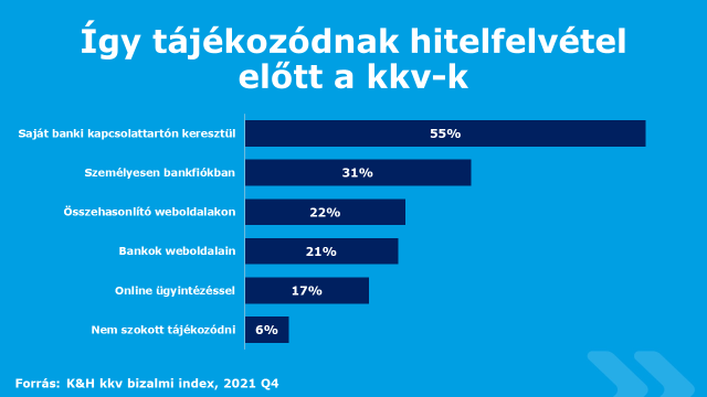 A cégek több mint fele (55%) saját kapcsolattartón keresztül, nagyjából harmada (31%) pedig személyesen, bankfiókban tájékozódik, amikor kölcsönt szeretne felvenni, derül ki a K&H kkv bizalmi index 2021 utolsó negyedévi felméréséből. „A kutatás rávilágít arra, hogy a vállalkozások nagy része személyesen intézi a hitelfelvételt. Vagyis a napi bankolásban használt innovatív, digitális megoldások mellett a nagyobb horderejű pénzügyi döntésekben az élő kapcsolatok és az ügyfelek igényeire szabott tanácsadás továbbra is fontos” - értékelte az eredményeket Rammacher Zoltán, a K&H kkv marketing és értékesítés támogatás vezetője.