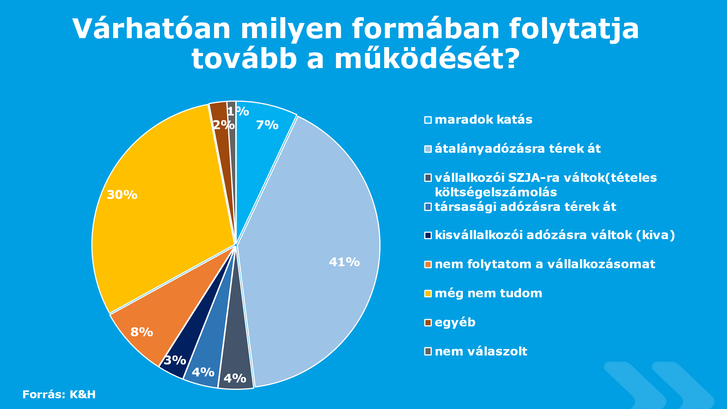 „Úgy tűnik, hogy azok számára, akik szeptember 1-jétől már nem választhatják a katát, az átalányadózás lehet a leginkább kedvező megoldás. A megkérdezett vállalkozások 41 százaléka ezt az adózást választaná és csak alig több mint tizedük mondta azt, hogy tételes költségelszámolással, társasági adózással vagy kivával folytatná tovább a működést” - mutatta be az eredményeket Rammacher Zoltán, a K&H kkv marketing és értékesítés támogatás vezetője.