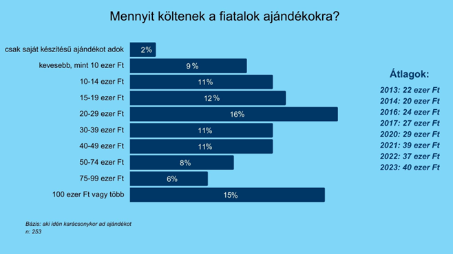 Jelentős eltérések láthatóak a fiatalok között a részletes adatok alapján. Az ajándékozást tervező fiatalok 2 százaléka egyáltalán nem vásárol, hanem inkább saját maga készíti el a meglepetéseket. 9 százalékos azoknak az aránya, akik kevesebb mint 10 ezer forintos összeget szánnak a vásárlásra. 23 százalékuk 10-19 ezer forintos kerettel vág neki a szezonnak, ami egy évvel korábban 21 százalékukra volt igaz. A 20-49 ezer forintos karácsonyi költségvetéssel rendelkezők aránya 38 százalékra nőtt a tavalyi 37 százalékról. Az 50-99 ezer forintos kiadással számoló fiatalok aránya 14 százalékra csökkent a tavalyi 17 százalék feletti szintről. Ugyanakkor megduplázódott azok száma, akik több mint 100 ezer forintot költenének: az ajándékozó fiatalok 15 százalékát képviselték az idén, míg 2023-ban csak 7 százalékukra volt ez igaz.