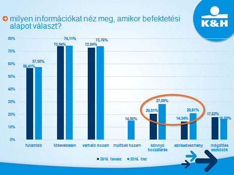 Még mindig a tőkevédelem és a várható hozam a legfontosabb szempont a befektetők számára, ha befektetési alapot választanak. Az évek óta tapasztalt alacsony kamatkörnyezet azonban megtette hatását, és jól láthatóan felértékelődött az adókedvezmények és adójóváírások szerepe, amely látványosan növelheti a megtakarítással elért hozamot - ez derült ki a K&H Alapkezelő prémium befektetők körében végzett felméréséből. A gyakorlatban ez az jelenti, hogy a befektetők körében erősödik a hosszú távú gondolkodás, hiszen a tartós befektetési számlák (TBSZ) és a nyugdíj-előtakarékossági számlák (NYESZ) nyújtotta adójóváírásokat, illetve adókedvezményeket az előző esetén 3-5, az utóbbi esetében pedig 10 éves időtávon lehet a legjobban kihasználni. Fontos változás emellett az is, hogy a hazai befektetők növekvő figyelmet fordítanak a rugalmasságra, a könnyű hozzáférhetőségre is.