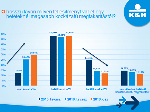 Az elmúlt másfél év során a megtakarítók hozamelvárásai is alkalmazkodtak az alacsony kamatkörnyezethez: több mint kétszeresére nőtt azok száma, akik egy hosszabb távú megtakarítással már a betéti kamatoknál 3%-kal magasabb hozammal is megelégednek, miközben a betétekhez képest 10%-os plusz hozamra csak közel minden tizedik megtakarító számít.