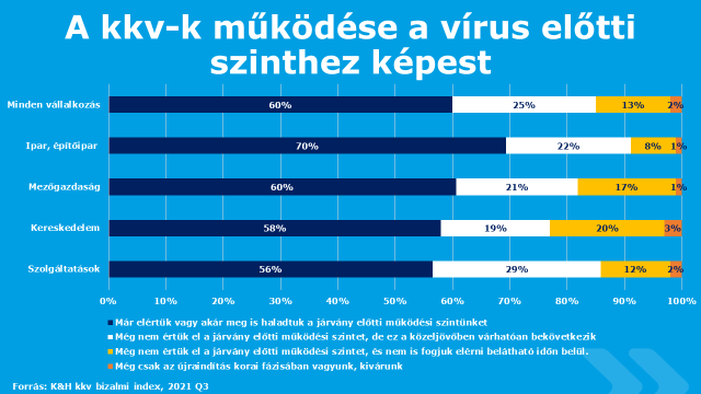 A szektorok tekintetében az ipari, építőipari cégek tudtak regenerálódni a leggyorsabban, esetükben már 70 százalék elérte vagy meg is haladta a járvány előtti teljesítményét. A szolgáltatókat ennél jobban megviselte az utóbbi másfél év. A korlátozások hatásai még most is láthatók: a szektorban a vállalkozások alig több mint felének (56%) sikerült csak újra elérni a vírus kitörésekor fennálló működési szintet, amit a járványhelyzet súlyosbodásával járó esetleges szigorítások tovább nehezíthetnek.