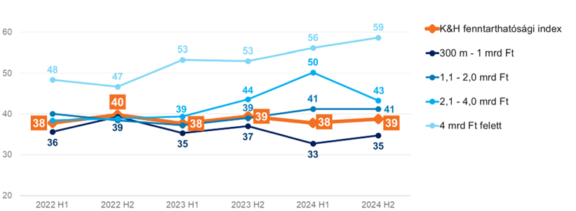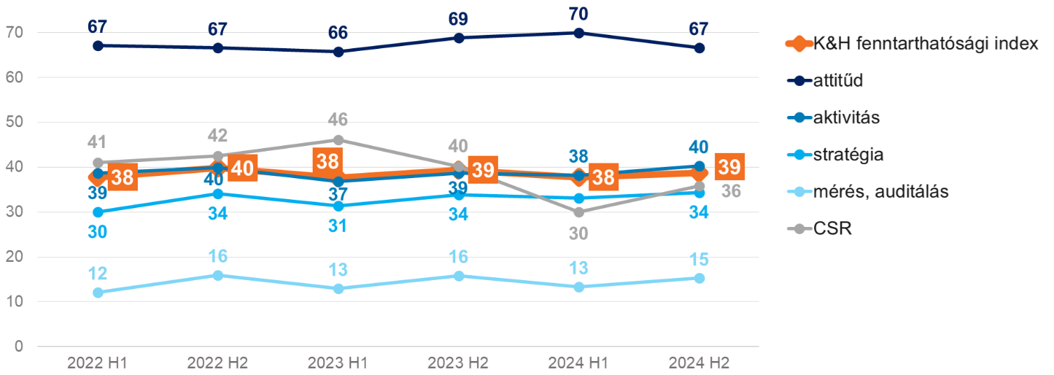 A K&H fenntarthatósági index legutóbbi eredményei alapján a fenntarthatóság iránti vállalati elköteleződés stagnálást mutatott 2024 második félévében. Az index, amely a 300 millió forint éves árbevétel feletti magyar vállalkozások fenntarthatósági teljesítményét méri, ezúttal 39 pontot ért el, ami egy ponttal magasabb az előző félév eredményénél. Az értékek továbbra is a közepesnél gyengébb szintet tükrözik, és leginkább a nagyvállalatok szabályozási kötelezettségeknek való megfelelése hajtja.