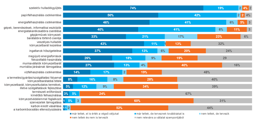 Az aktivitás alindex emelkedése annak köszönhető, hogy egyre több cég vesz részt energiatakarékossági programokban (86%), környezetbarát gépeket, járműveket használ (54%) vagy támogatja az alkalmazottak fenntartható közlekedését (40%). Ugyanakkor csökkent a természeti erőforrások kímélőbb felhasználását célzó erőfeszítések aránya (9%).