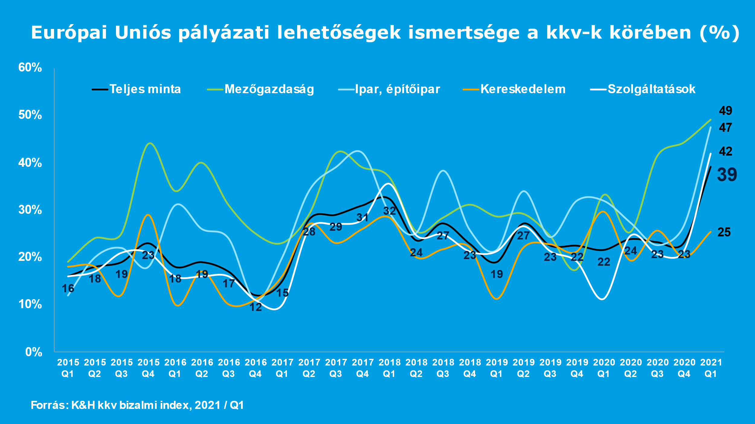 „A K&H kkv bizalmi index kutatás 2021. első negyedéves adatai alapján rendkívül megugrott az érdeklődés az uniós pályázati források iránt. A pályázati hajlandóságot mutató részindex mintegy másfélszeresére nőtt, 15 pontos emelkedéssel jelenleg 43 ponton áll, de ha a trend folytatódik, akár az 50-es szintet is elérheti, amire az utóbbi 6 évben nem volt példa. Jelenleg a cégek 39 százaléka hallott olyan pályázati lehetőségről, ami komolyan érdekli, ez szintén nagyon erős, 16 százalékpontos emelkedést jelent, az előző negyedévhez képest. Sőt, az agrár és az ipari cégek körében még magasabb ez az arány, mindkét szektorban a cégek majdnem fele, 49, illetve 47 százalék jelezte, hogy találkozott érdemleges pályázati lehetőséggel” – mondta el a kkv-k pályázatokkal kapcsolatos tájékozottsága kapcsán Kökény Roland, a K&H kkv marketing és értékesítés támogatás vezetője.
