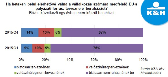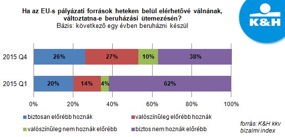 Az eredmények arra is rávilágítanak, hogy egyre több cég az EU-s pályázati forrásoktól is függővé teszi fejlesztéseit, és hajlandóak változtatni beruházási terveiken. „Azok körében, akik idén beruházást terveznek, 53%-uk ütemezné át és hozná előbbre beruházásait, amennyiben heteken belül elérhetővé válnának az uniós pályázatok. Tavaly év elején még csak a vállalkozások harmada nyilatkozott így. Azon cégeknél, amelyek tervei között nem szerepel fejlesztés, egy év elteltével 19% helyett már 27% tervezne beruházást, ha rövid időn belül megjelennének a cég szempontjából releváns pályázati kiírások” – mondta el a szakember.