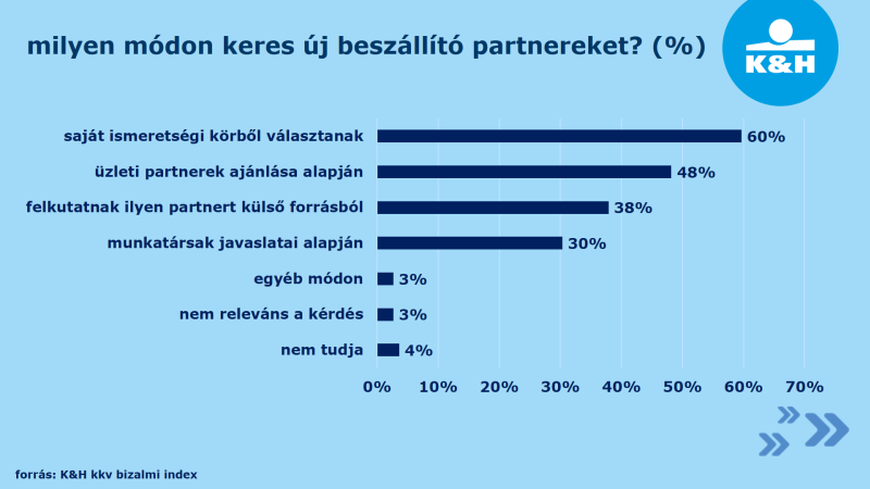 Nem könnyű a kis- és középvállalkozók beszállítójává válni ma Magyarországon, 10-ből 6 kkv ugyanis a már bevált, jól ismert alvállalkozókkal dolgozik együtt – derül ki a K&H kkv bizalmi index kutatás legutóbbi adataiból. Ha mégis új beszállítópartnert kell keresni, a cégek elsősorban saját ismertségi körükből választanak, mivel a döntésnél a megbízhatóság a legfontosabb szempont.