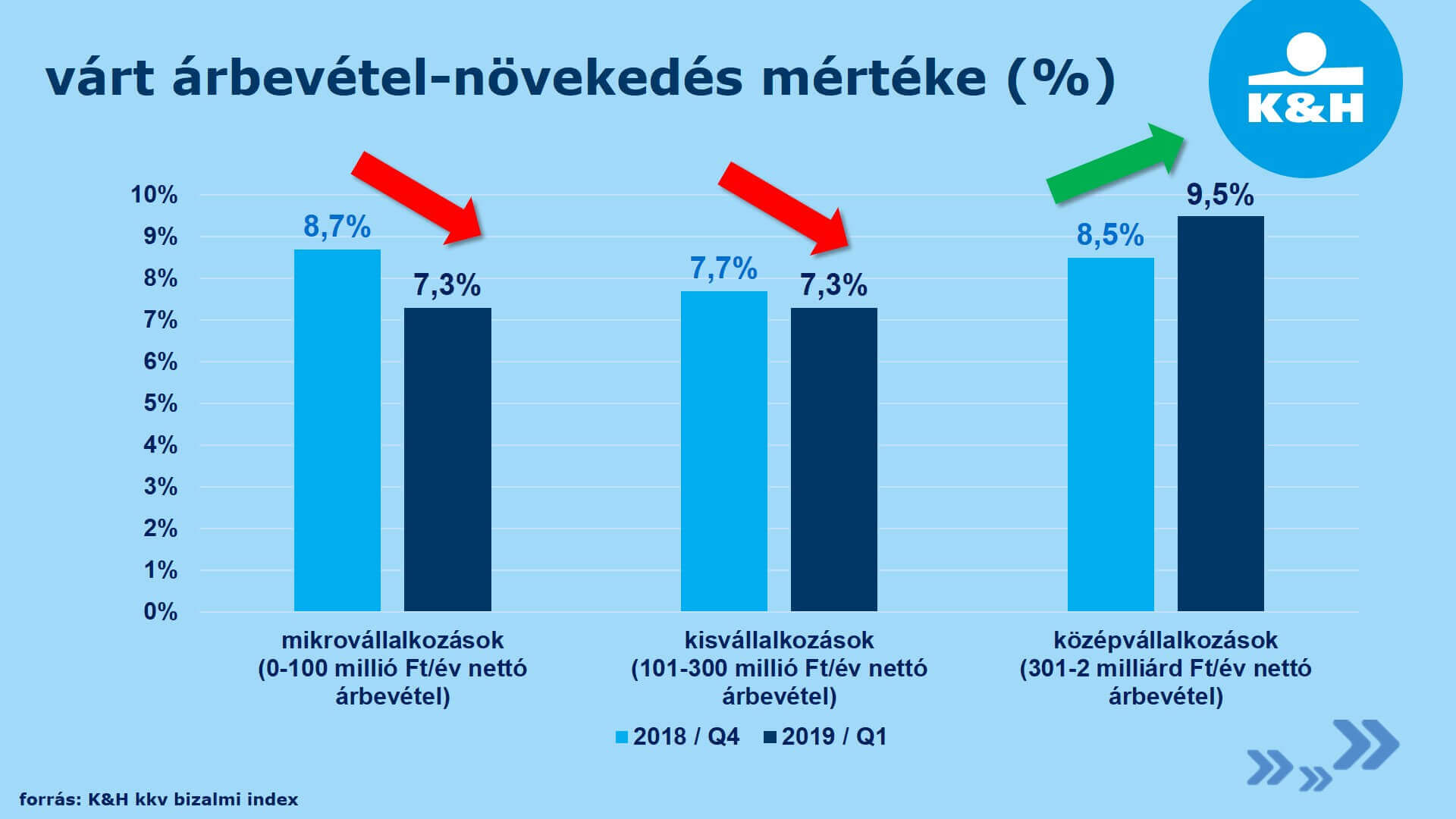 A K&H és a GfK Magyarországon elsőként kezdte el vizsgálni a hazai mikro-, kis- és középvállalkozások következő egy évre jellemző várakozásait. A 2004 óta folyamatosan készített negyedéves K&H kkv bizalmi index összeállítása 400 magyarországi székhelyű, 2 milliárd forint* éves árbevétel alatti társaság üzleti döntéshozóinak megkérdezésével történik. A kutatásában a vállalkozások gazdasági helyzetét leginkább befolyásoló 10 gazdasági tényezőt és annak várt változásait vizsgálják: vevői kapcsolatok, szállítói kapcsolatok, munkaerő, vállalat pénzügyei, bankok, gazdaságpolitika, közterhek, EU, versenyhelyzet, vállalati hitelkamatok. A K&H kkv bizalmi index a 10 részindex súlyozott átlaga, annak megfelelően, hogy az egyes tényezőket mennyire fontosnak ítélik a vállalkozások. A legutóbbi felmérés 2019. március 20. és április 4. között történt.