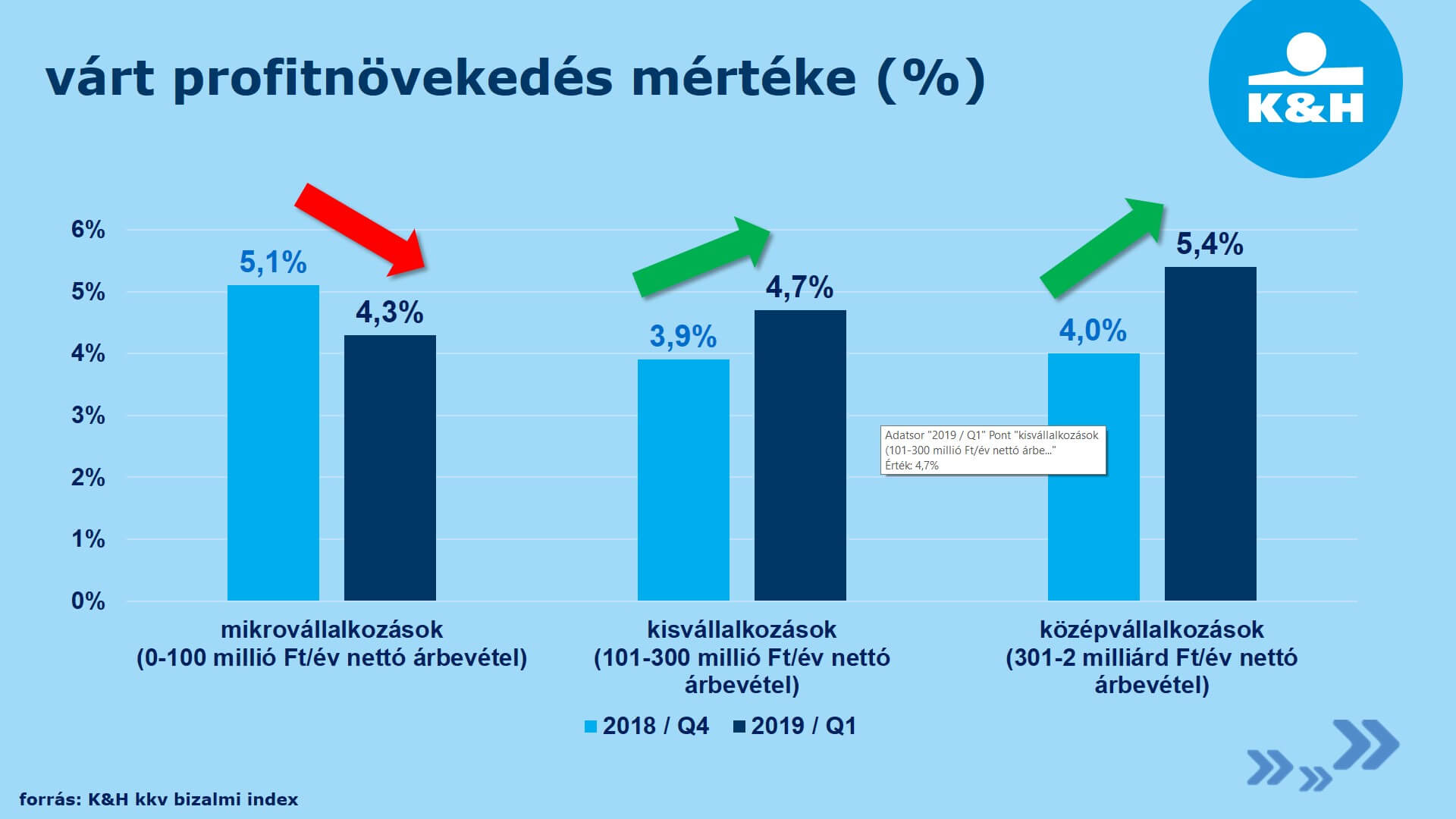A korábbiakhoz képest szerényebb, 7,5 százalékos árbevétel-növekedéssel, ugyanakkor stabil, 4,5 százalékos profitnövekedéssel terveznek a hazai cégek a következő egy évben – derül ki a K&H kkv bizalmi index kutatás legutóbbi adataiból. Pénzügyeik alakulásával kapcsolatban a középvállalkozások a legoptimistábbak, míg az ágazatok közül az árbevétel tekintetében az ipar, a profitot tekintve azonban a kereskedelem vár kiemelkedő évet.