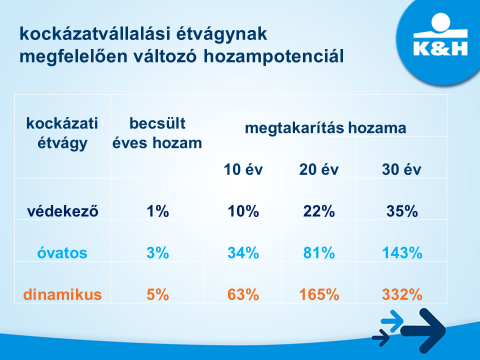 „Míg a befektetési időtáv viszonylag egyszerűen megadható, addig a kockázatvállalási képesség meghatározása ennél jóval összetettebb, ugyanakkor döntő fontosságú lépés. Ehhez legalább két tényező, a kockázatvállalási kapacitás és a kockázatvállalási étvágy feltérképezése szükséges, amelynél az előbbi a komolyabb anyagi probléma nélkül átvészelhető maximális veszteség mértékét, az utóbbi pedig az árfolyamingadozások tolerálásának képességét jelenti” – mondta el Horváth István. „E két összetevő azonban nem külön-külön, hanem leginkább egymáshoz viszonyítva értelmezhető: ha a kockázatvállalási képesség nagyobb, mint a kockázati étvágy, akkor a befektető jelentős hozamtól esik el. Ennek mértéke pedig egy generáció alatt akár a megtakarítás többszöröse is lehet!” – hangsúlyozta ki szakember.