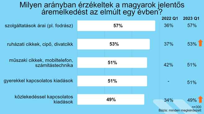 Az elmúlt év elején még csak az élelmiszerek és az italok esetén lépte át az 50 százalékot azoknak a válaszadóknak az aránya, akik szerint jelentősen nőtt ezen termékek ára. Tavaly január-márciusban 57 százalékuk, áprilisban 60 százalékuk mondta azt, hogy az élelmiszerek és az italok jelentősen drágultak. Idén, azaz 2023 első negyedévében már csak a közlekedéssel kapcsolatos kiadások esetén maradt 50 százalék alatt, egész pontosan 49 százalékon azok aránya, akik jelentős áremelkedést tapasztaltak. Minden egyéb termékkör és szolgáltatás - ételek, italok, szórakozás, lakhatási és gyerekhez köthető kiadások, ruhák - esetében 50 százaléknál magasabb volt ez az arány.