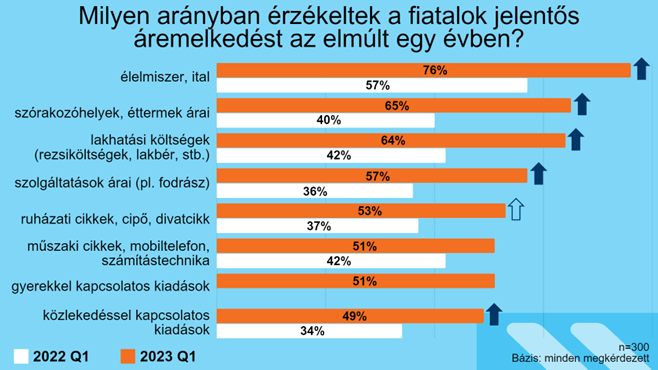 A szórakozóhelyek, éttermek árait a fiatalok 65 százaléka látta jóval magasabbnak a korábbinál. A lakhatási költségek emelkedése került a harmadik helyre, miután a megkérdezettek 64 százaléka említett jelentős áremelkedést. A nők és férfiak aránya ebben a kérdésben 71 és 65 százalékos volt. A K&H ifjúsági indexben választ adók 57 százaléka szerint a szolgáltatások - például a fodrász - is jelentősen drágultak. A ruházati cikkeknél 53, a műszakiaknál pedig 51 százalékuk volt ezen a véleményen. Szintén 51 százalékos azoknak az aránya, akik szerint a gyerekkel kapcsolatos költségek nőttek számottevően.