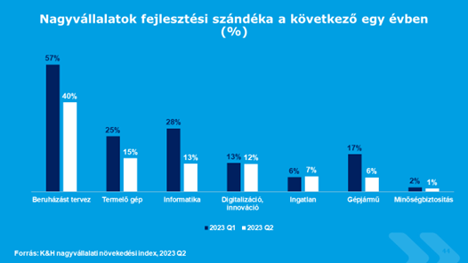 A kutatásból kiderül, hogy az egyéb fejlesztéseket tekintve megszakadt az előző negyedévben tapasztalt optimizmus. Az akkori 57 százalékhoz képest ugyanis jelenleg a vállalatok csupán 40 százaléka tervez fejlesztést a következő egy évben, ami az index történetében az eddigi legalacsonyabb arány. A beruházást tervezők leginkább termelő gépbe (15%), informatikába (13%) vagy digitalizációba és innovációba (12%) fektetnének, tehát főként hatékonyságnövelő fejlesztésekben gondolkodnak a vállalatok. A nagy fejlesztési hullám nem most fog elkezdődni, az első két beruházási célt tervezők aránya ugyanis mélyponton van. A termelő gépek beszerzése 10 százalékponttal, míg az informatikai beruházások 15 százalékponttal visszaestek az előző negyedévhez képest.