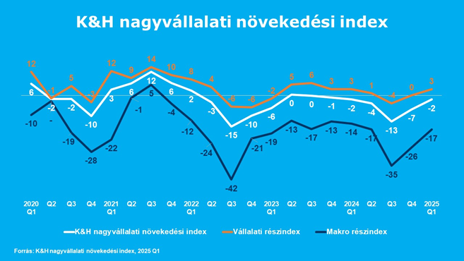 Úgy tűnik, kitart a tavaly év végén kezdődött, javuló tendencia a nagyvállalatok körében, amellyel gazdasági kilátásaikról vélekednek. A cégvezetők meglátásait vizsgáló K&H nagyvállalati növekedési index 2025 első három havi kutatási adatai szerint a mutató nagy ugrással ismét visszatért a semleges tartomány közelébe, 11 pontos emelkedéssel -2 ponton áll. Utoljára három éve lehetett ilyen mértékű emelkedést látni, azt követően, hogy az index történetének legrosszabb eredményét mérte a bank a nagyvállalatok körében.