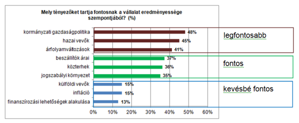 A nagyvállalatok eredményeit meghatározó tényezők sorrendjében a beszállítói árak, a jogszabályi környezet és a közterhek változásának hatása a középmezőnyben szerepel, holott utóbbi kettő fontossága kissé felértékelődött év végéhez képest. A lista végén levő külföldi vevőket, az inflációt és a finanszírozási lehetőségek alakulását továbbra is a cégvezetők csupán töredéke tartja fontosnak a vállalat rövid távú jövedelmezősége szempontjából.