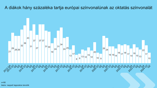 A dolgozó fiatalok 27 százaléka formált kifejezetten vagy inkább jó véleményt a magyar oktatásról, ami viszont magas érték az elmúlt évek adataival összehasonlítva: legutóbb 2016–2017-ben mértek ilyen jó adatot. Ez megelőzően a 2010-es évek elején áll az idei második negyedévihez hasonló szinten ez a mutató. A válaszadók 18 százaléka alá csökkent azoknak az aránya, akik inkább rossz véleménnyel vannak az oktatásról, mint jóval. Ugyanakkor ahhoz még kevesek az adatok, hogy trendszerű változásról beszélhessünk ezen a téren.