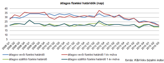 Ezzel párhuzamosan a szállítói számlák kifizetésének teljesítése is kedvező szinten maradt. A cégek átlagosan 19 napra fizetnek beszállítóiknak, amit a várakozások szerint egy év múlva is tartani tudnak majd. „A vevői és szállítói fizetési határidők több éve tartó csökkenésével a kifizetések közötti finanszírozási időtáv is kedvezően alakul idén. Jelenleg mindössze átlagosan 2 nappal kell számolniuk a cégeknek, amely jelentős előrelépés az elmúlt évekre jellemző 6-10 naphoz képest” – mondta el a szakértő.