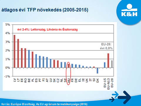 „Az EU agrárszektorában 2005 és 2015 között a TFP átlagosan 0,8%-kal nőtt évente, míg Magyarországon ennek durván a felével, körülbelül 0,4%-kal. Ehhez képest a balti államok és Románia mezőgazdasága 2-4%-os éves növekedést produkált. Jól látható tehát, hogy van még hova fejlődni” – hangsúlyozta ki Tresó István, a K&H Agrárfejlesztési főosztály vezetője az agrárszakemberek számára rendezett Agrár Klub szakmai rendezvényén.